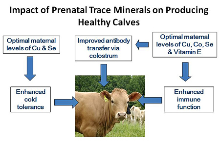 It goes without saying that properly fed dams, receiving proper mineral nutrition during pregnancy, particularly copper, selenium and zinc, will give birth to thriftier calves. This is partially due to improved quality and quantity of colostrum ingested by the calf to impart passive immunity. The mentioned minerals are key building blocks in antibody production. Additionally, these calves will be born with adequate supplies of these key minerals so that their own bodies will have what they need for the development of their own immune system.